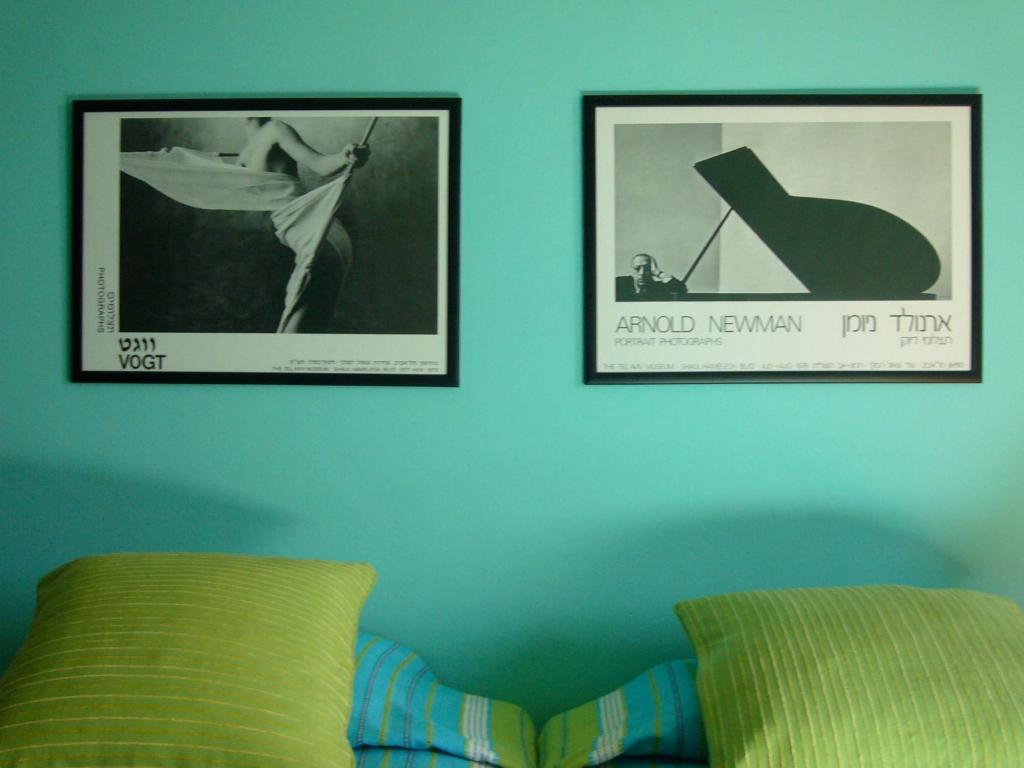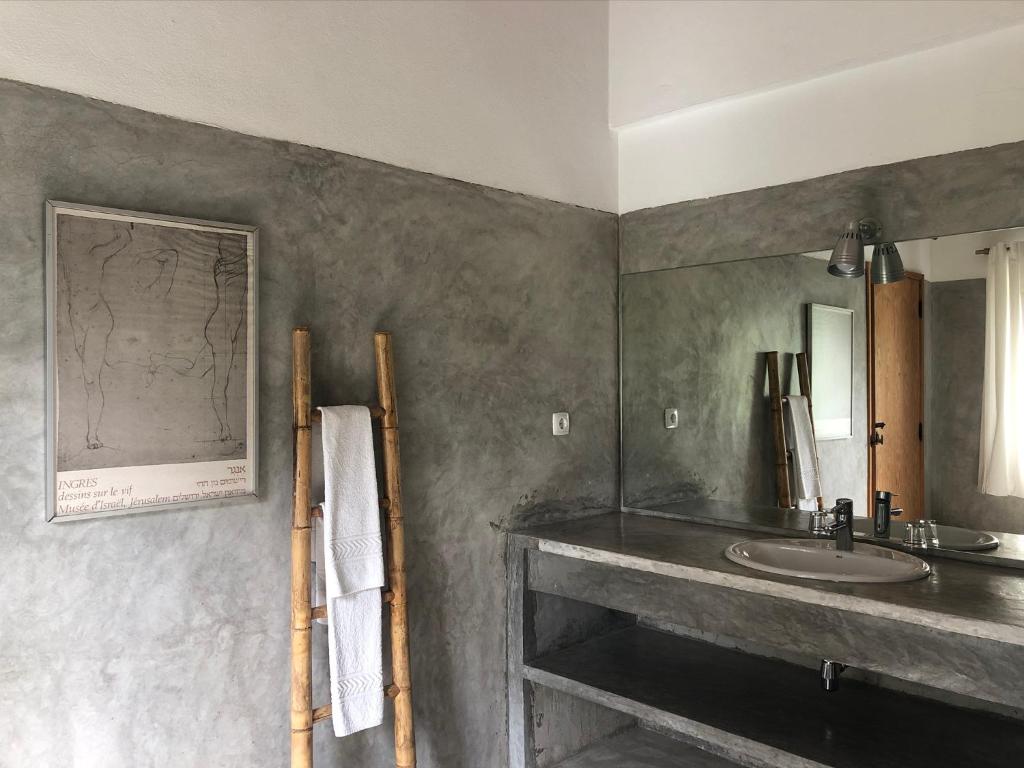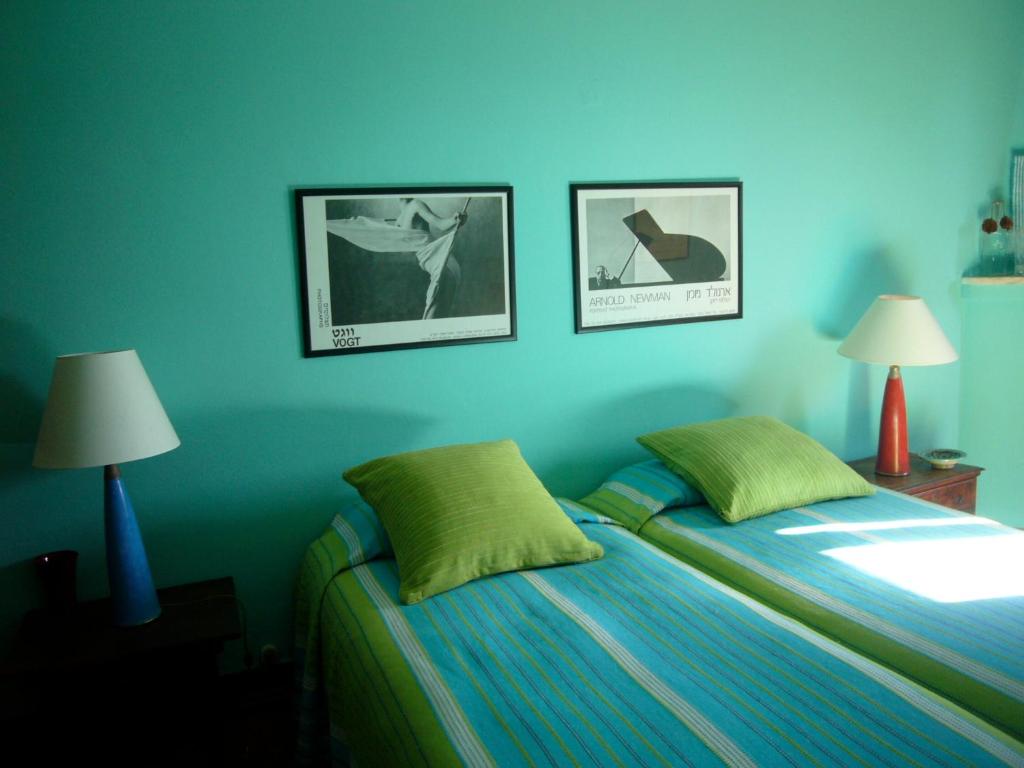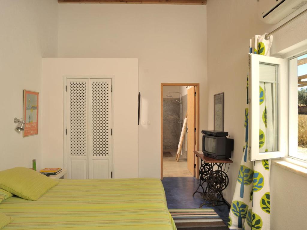Este quarto com ar condicionado está decorado com cores luminosas e mistura a origem rústica da propriedade com detalhes modernos.